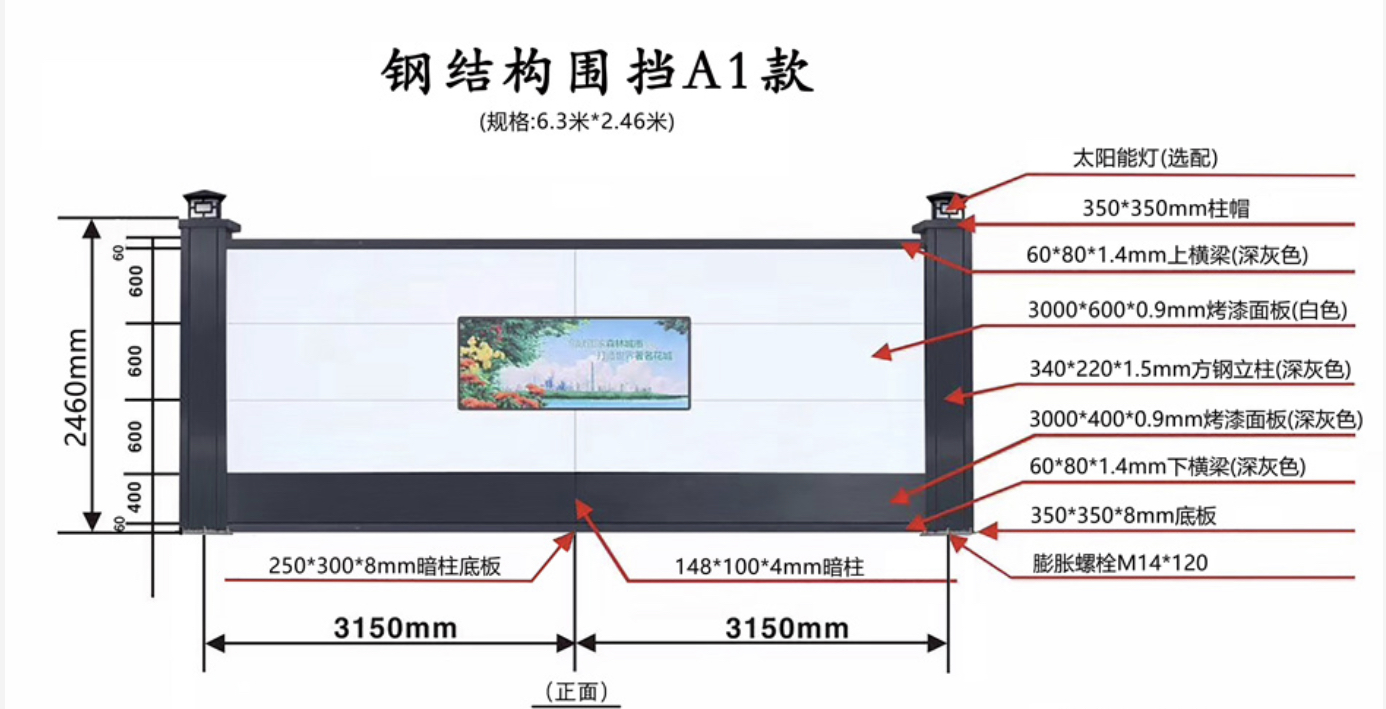A款鋼結(jié)構(gòu)圍擋、C款鋼結(jié)構(gòu)圍擋、PVC圍擋無(wú)論是在外觀的美觀方面還是在性能的穩(wěn)固耐用方面,來(lái)說(shuō)算是性?xún)r(jià)比比較高的圍墻,在一些地鐵站出口的兩邊、市政道路兩邊、小區(qū)樓盤(pán)外圍等地方的A類(lèi)烤漆鋼結(jié)構(gòu)圍擋,很多時(shí)候在項(xiàng)目完工時(shí)也會(huì)保留下來(lái)。
