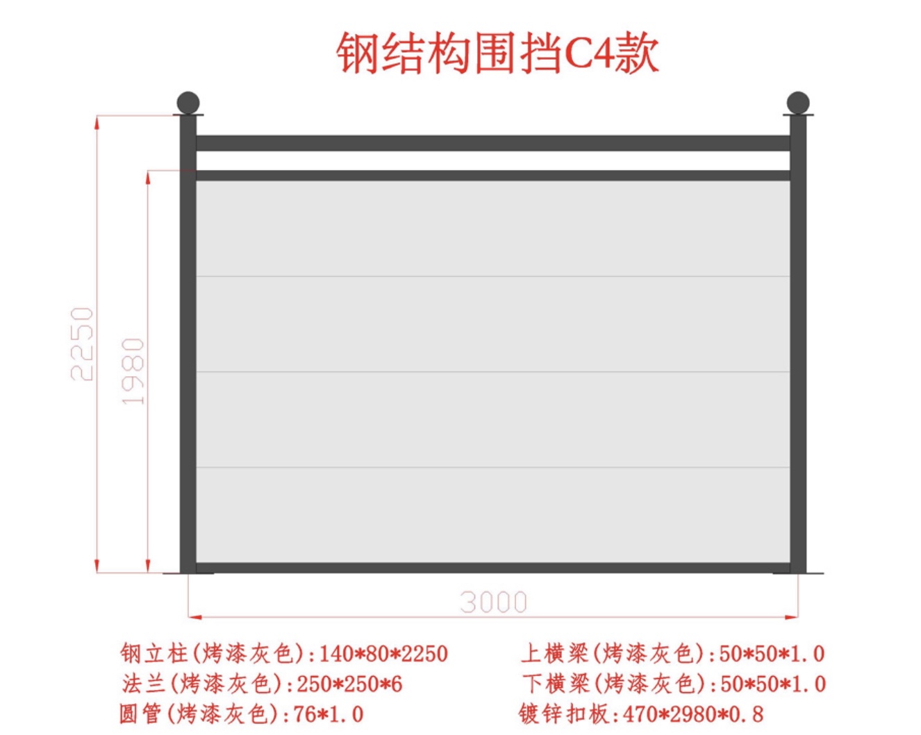 而鋼結(jié)構(gòu)圍擋C款是在深圳市交委方案標(biāo)準(zhǔn)設(shè)計(jì)的基礎(chǔ)上,稍做優(yōu)化,上下橫梁為50*50方通,圓梁改為76鋼管,面板為鍍鋅扣板2980*470,灰色烤漆立柱高度為2.25米,加上預(yù)制基礎(chǔ)高度30cm,達(dá)到交委要求圍擋的整體高度、地面以上2.5m ,使人行道、廣場(chǎng)、泥巴地這些不易安裝的地方更好施工,并且為客戶(hù)節(jié)約了一定的材料費(fèi)用。